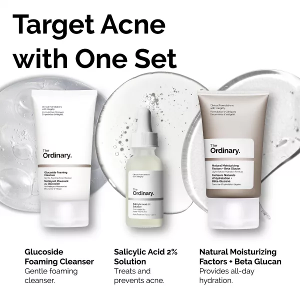 Qué más necesita saber: El limpiador en espuma Glucoside es un limpiador en espuma similar a un gel que elimina eficazmente la suciedad visible y las impurezas ambientales. La solución de ácido salicílico al 2 % es un suero a base de agua que ofrece una exfoliación a nivel de superficie, fomentando la eliminación natural de la piel muerta. También es lipófilo (soluble en aceite), lo que significa que puede penetrar los poros para reducir la aparición del acné. Los factores hidratantes naturales + beta glucano es un humectante en gel transparente y liviano que brinda hidratación durante todo el día y protege la piel de la pérdida de agua.