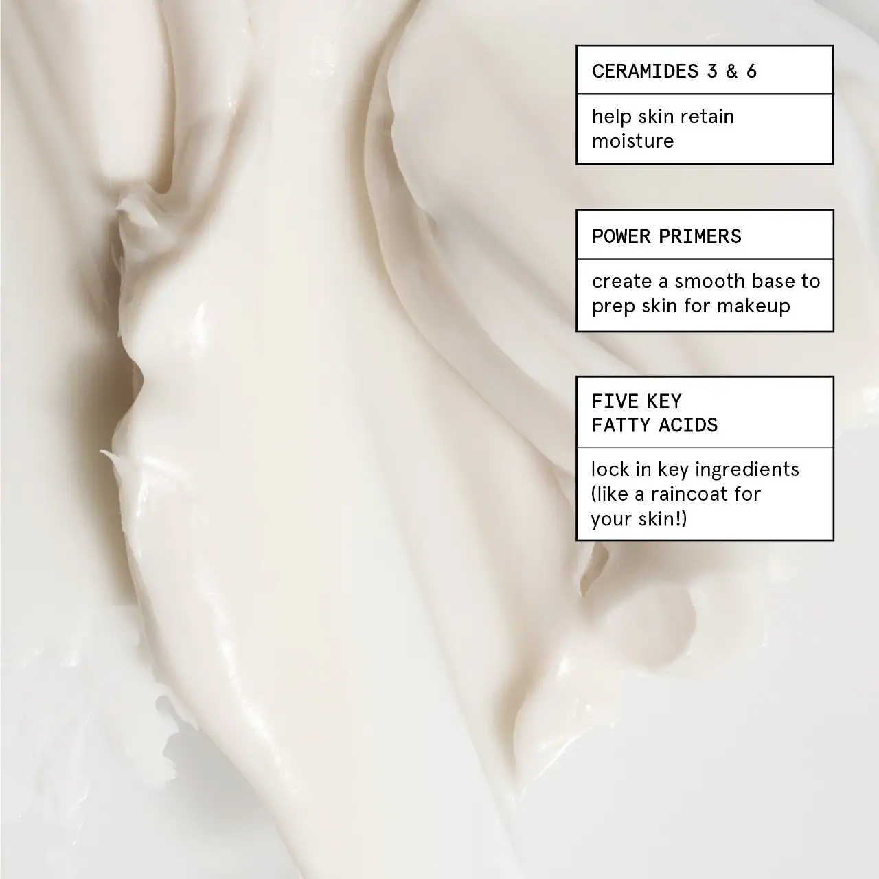 Qué es: un humectante base rico y de rápida absorción que refuerza la barrera de humedad de la piel y mejora visiblemente la luminosidad para un acabado limpio, húmedo y equilibrado.