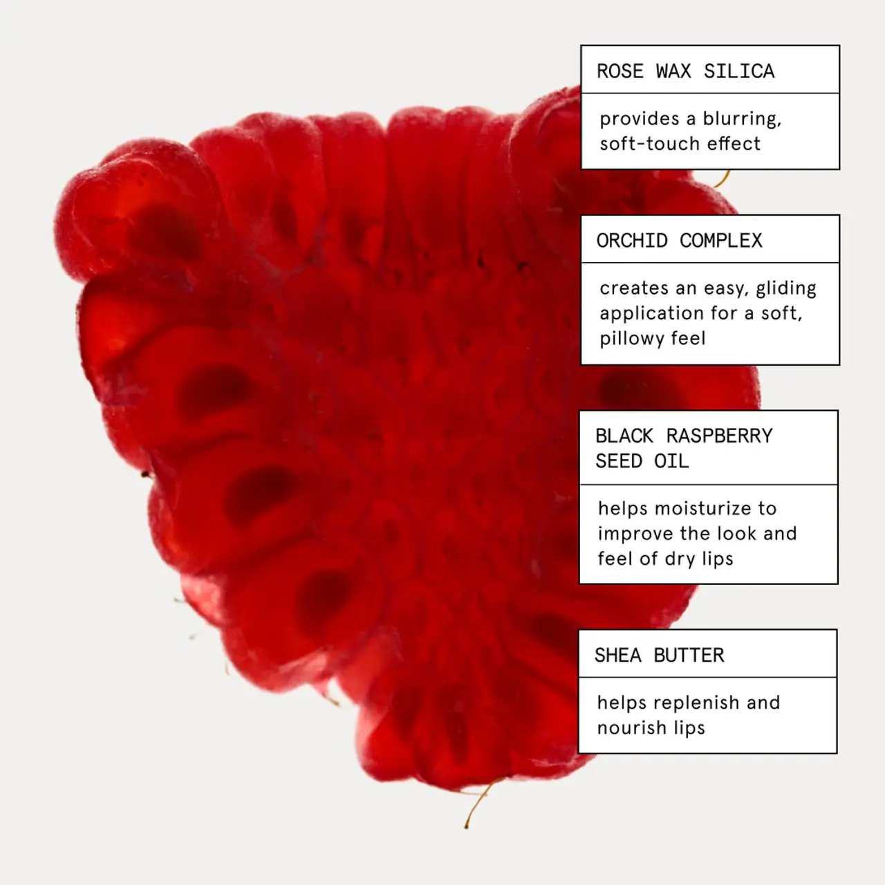 – Aceite de semilla de frambuesa negra: Hidrata para mejorar el aspecto y la sensación de los labios secos.