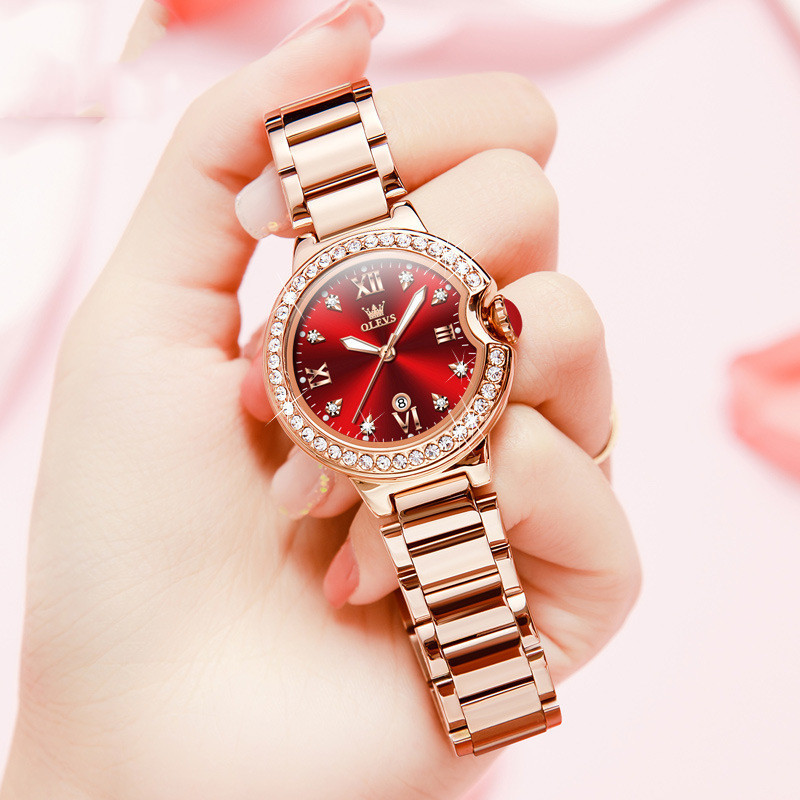 Color: cinturón de acero con cara roja y oro rosa completo para mujer, cinturón de acero con cara blanca y oro rosa completo para mujer