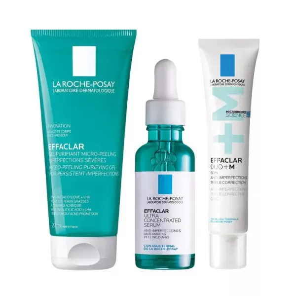 Esta rutina se compone de Effaclar Gel Limpiador Purificante 200 ml, Effaclar Sérum y Effaclar Dúo, que trabajan juntos para limpiar profundamente los poros, reducir el exceso de grasa, suavizar la textura de la piel y reducir la apariencia de las imperfecciones del acné.