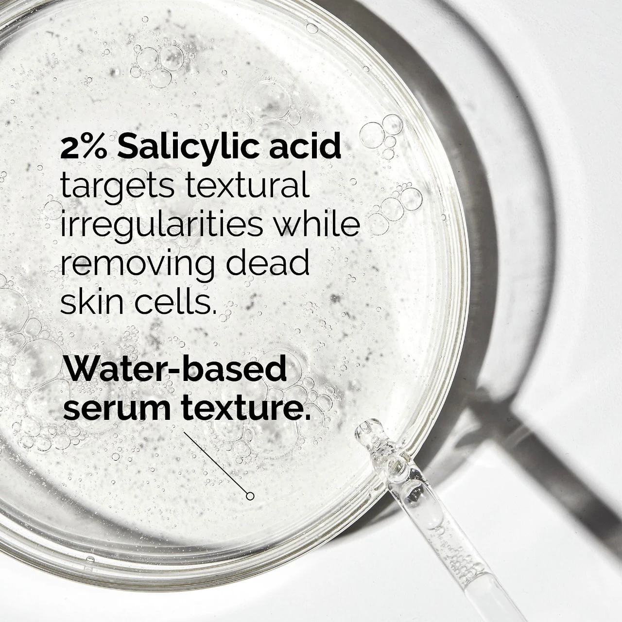 -Ácido Salicílico 2%: Exfolia, alisa y descongestiona visiblemente los poros.